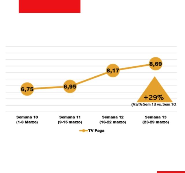 Específicamente, en el universo de personas con TV Paga en América Latina, la semana 13 del año (del 23 al 29 de marzo) registró un incremento del 29% en el encendido televisivo respecto a la semana 10 (del 2 al 9 de marzo).