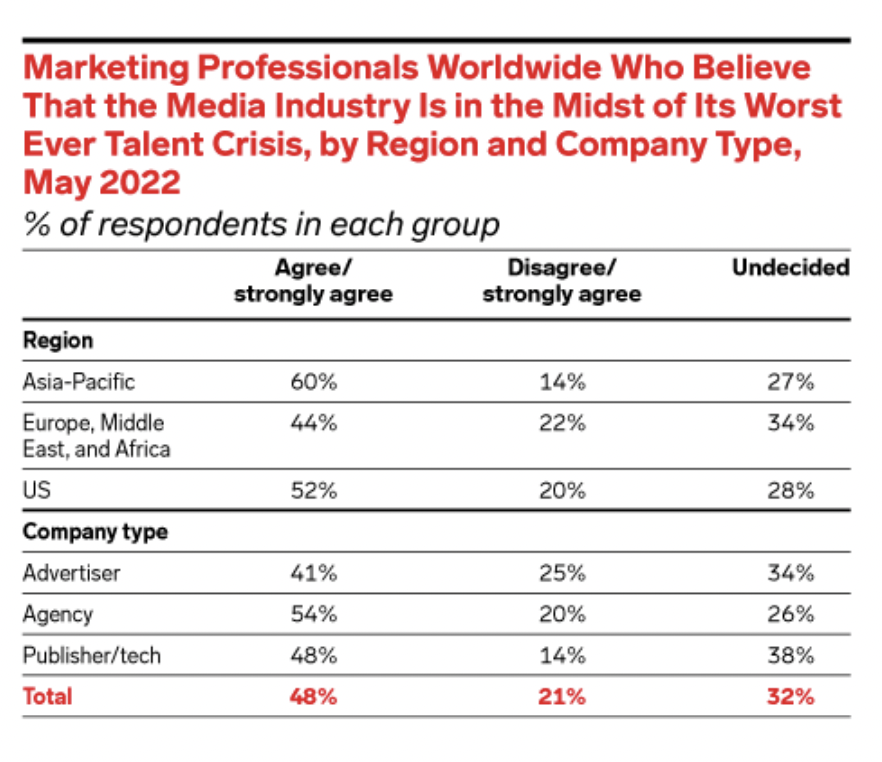 El 52% de los profesionales del marketing de EE.UU. cree que el sector de los medios de comunicación se encuentra en la peor crisis de talento de su historia, según la Federación Mundial de Anunciantes y Mediasense